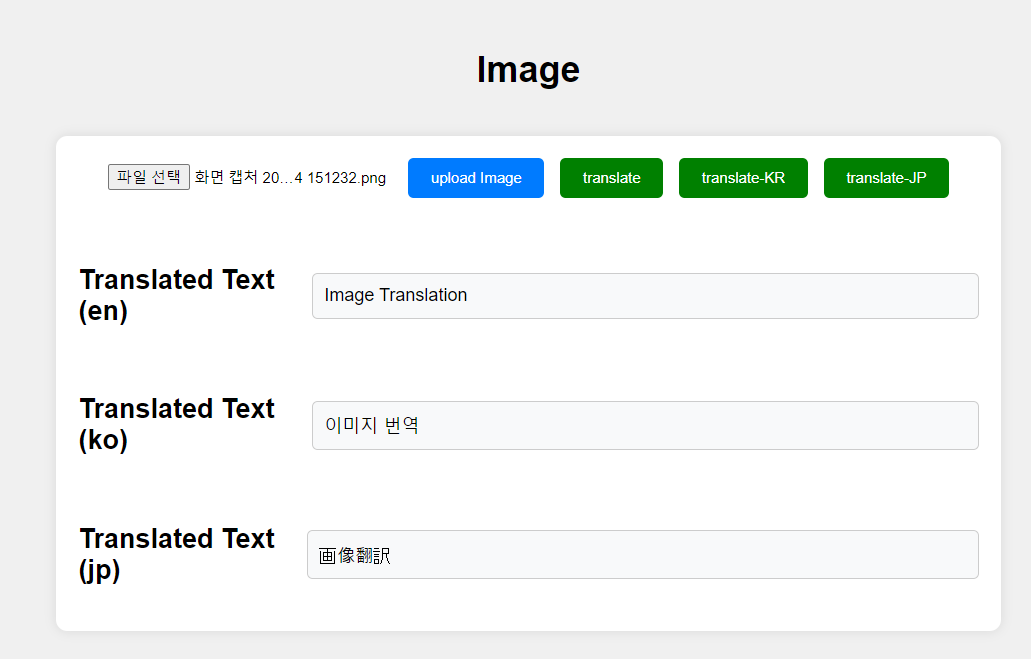 이미지 업로드 및 텍스트 번역 기능을 제공하는 웹 애플리케이션입니다. 주요 기능은 이미지에서 텍스트 추출과 번역입니다.