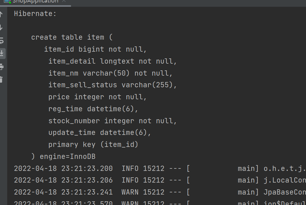 ShopApplication위치가 패키지 안에 들어가 있어서 테이블 생성되는 쿼리를 띄우지 못했었음... 또 당했다!😥