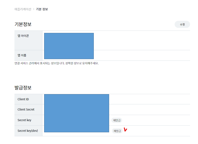 2. 기본 정보 Secrey key(dev)를 발급 후 테스트로 사용